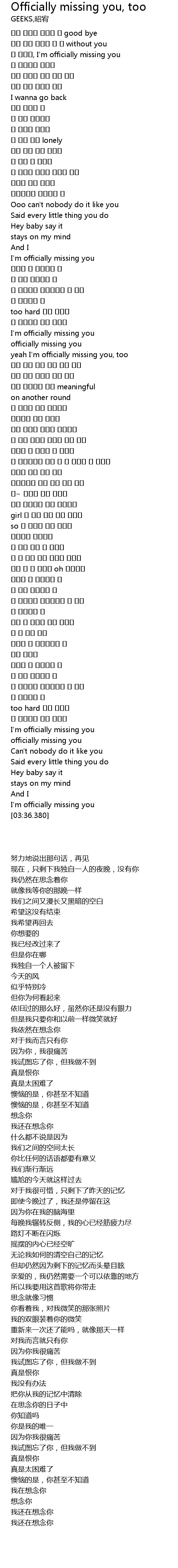 | [00:15.060] | 난 아직도, I'm officially missing you |