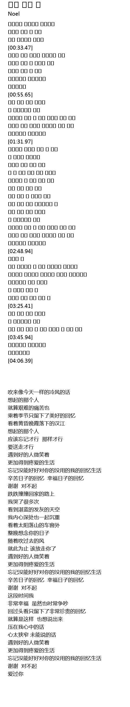| [03:38.09] | 잘해 주지 못한 내 못난 기억은 다 잊고 살아 |