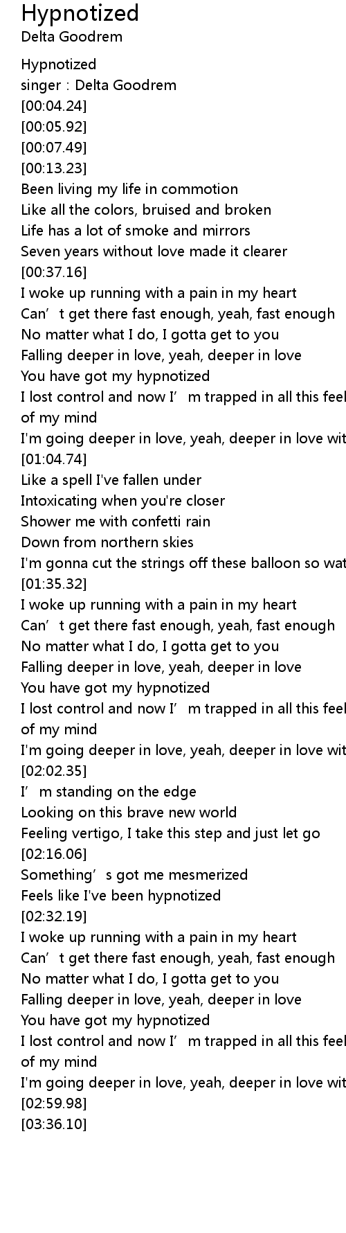| [02:28.31] | Feels like I' ve been hypnotized |