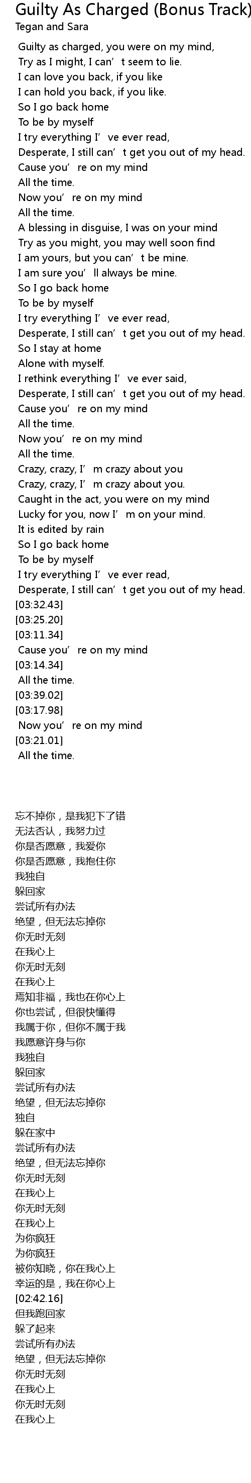 | [00:15.35] | Guilty as charged, you were on my mind, |