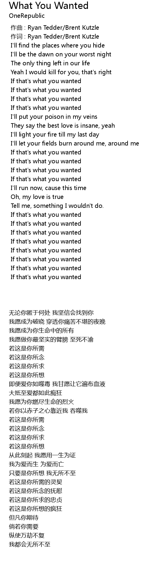 | [00:01.00] | 作词 : Ryan Tedder/Brent Kutzle |