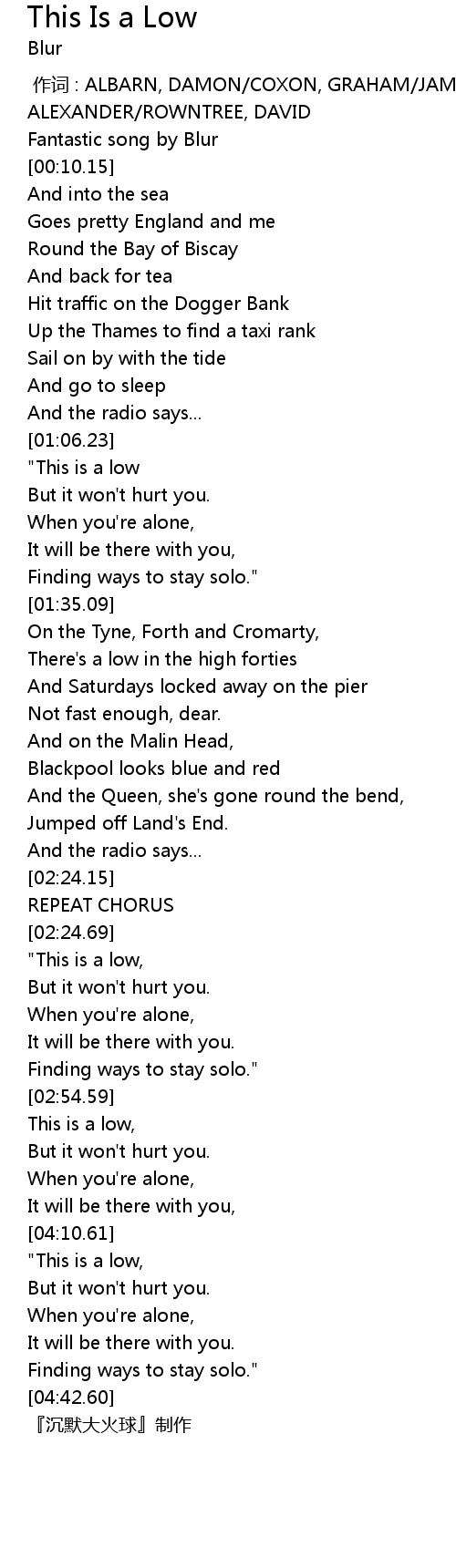 | [00:00.00] | 作词 : ALBARN, DAMON/COXON, GRAHAM/JAMES, STEVEN ALEXANDER/ROWNTREE, DAVID |