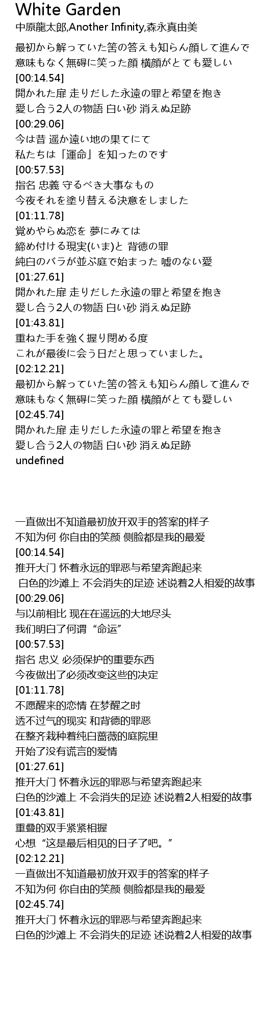 | [01:20.64] | 在整齐栽种着纯白蔷薇的庭院里 开始了没有谎言的爱情 |