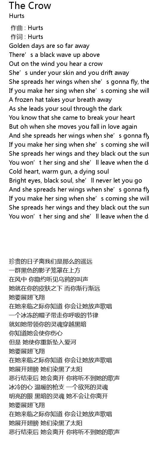 | [04:28.72] | And she spreads her wings when she' s gonna fly, the crow |