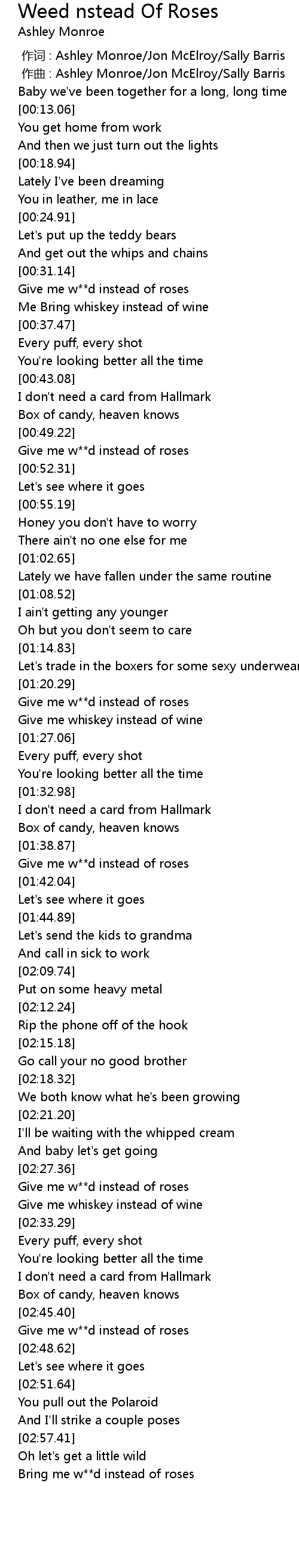 | [00:31.94] | Give me w**d instead of roses |