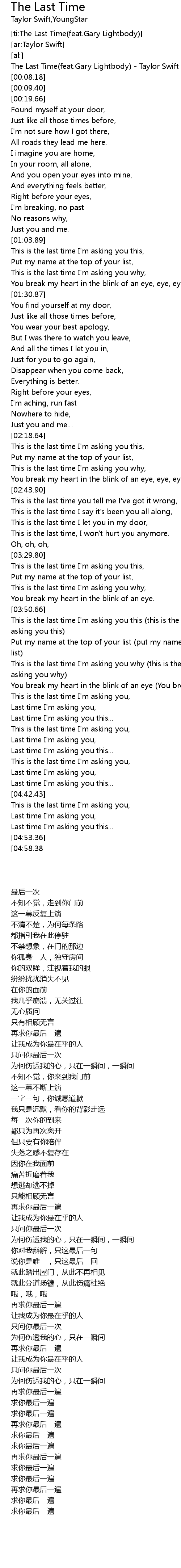 | [00:00.04] | The Last Time(feat.Gary Lightbody) - Taylor Swift |