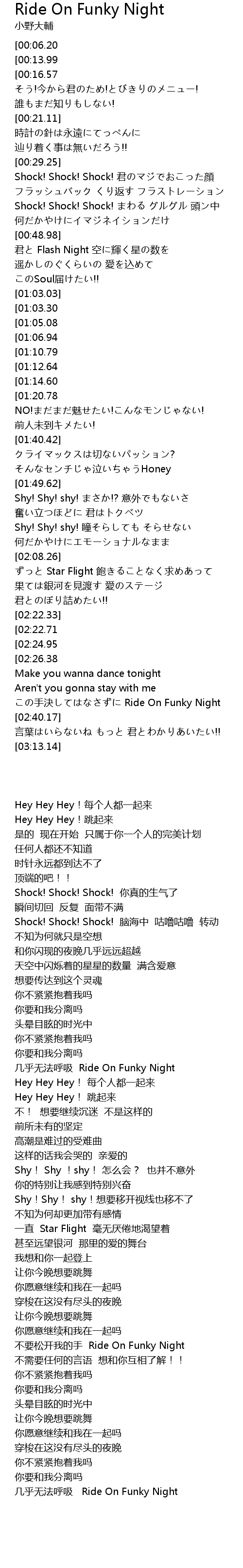 | [03:33.98][01:14.60] | 息も出来ないくらいさ Ride On Funky Night |