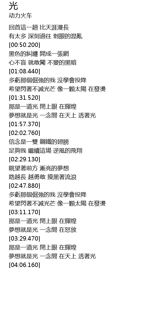| [01:41.509] | 夢想就是光 一念間 在天上 透著光 |