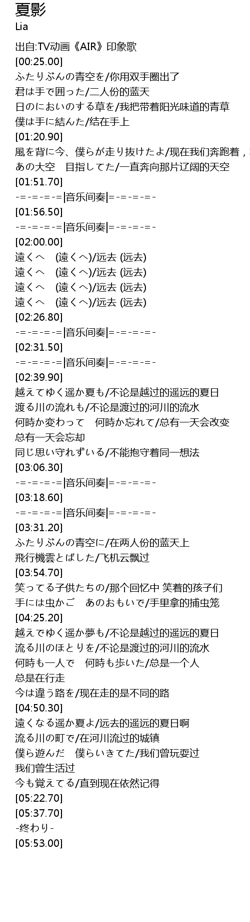 | [00:20.00] | 出自:TV动画《AIR》印象歌 |