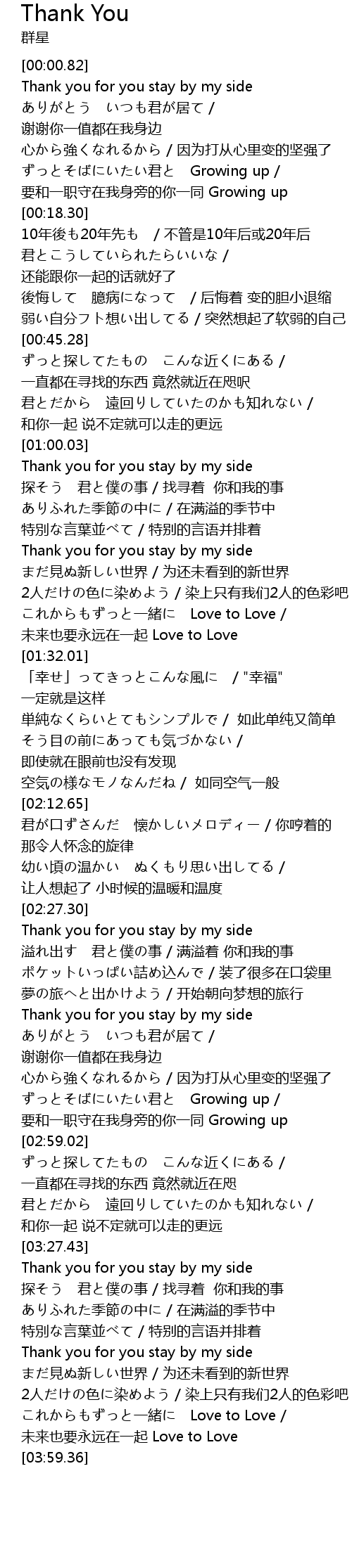 | [00:03.58] | ありがとう いつも君が居て / 谢谢你一值都在我身边 |