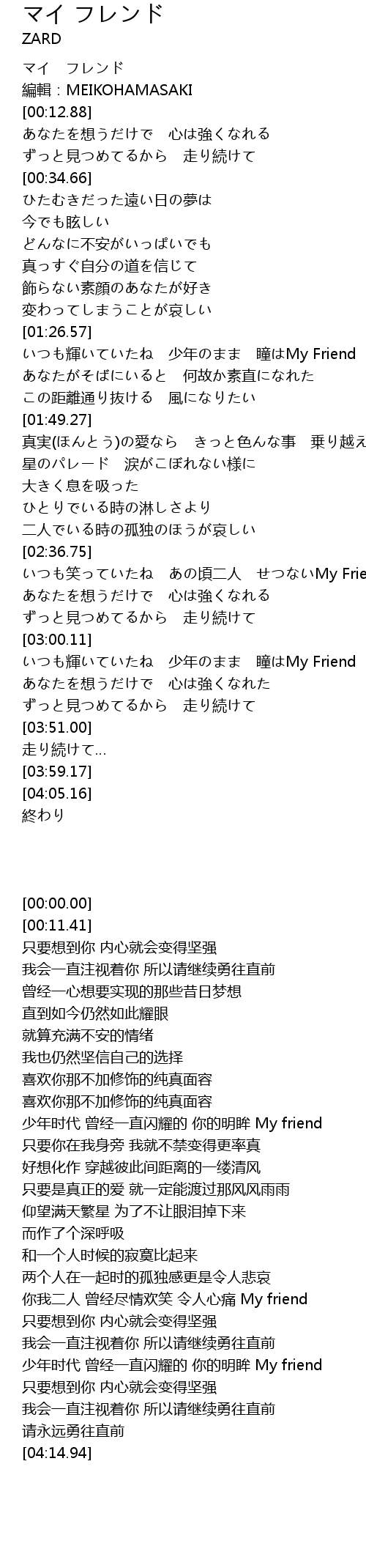 | [02:37.63] | いつも笑っていたね あの頃二人 せつないMy Friend |