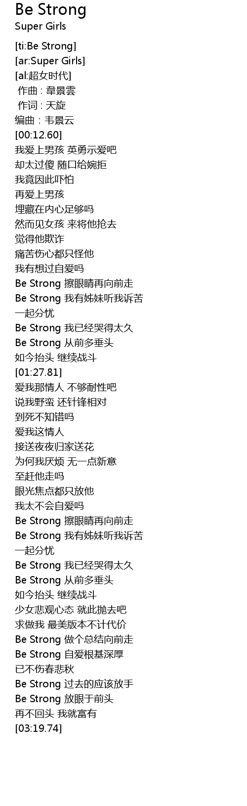 | [02:18.90] | Be Strong 我有姊妹听我诉苦 |