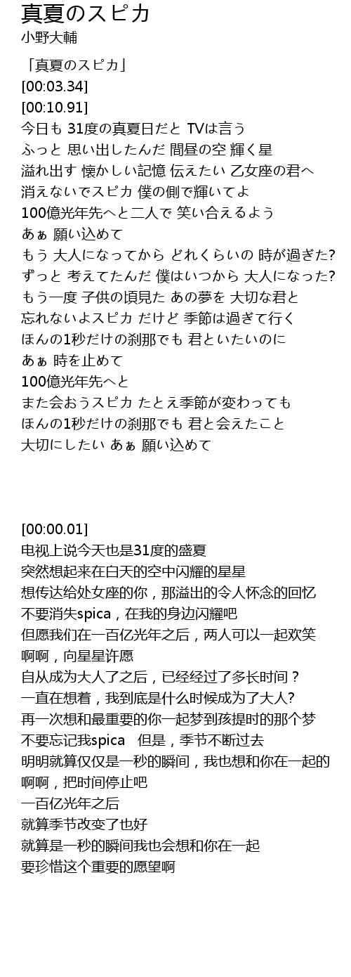 | [00:56.60] | 消えないでスピカ 僕の側で輝いてよ |