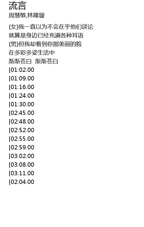 | [03:15.00][02:45.00][01:34.00] | (男)流言传来传去 说不停 |