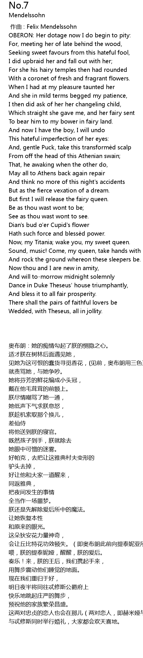| [00:06.500] | 见她为这可恨的蠢货寻觅香花,(见前,奥布朗用三色堇使得提泰妮亚爱上了变成了驴子的波顿) |