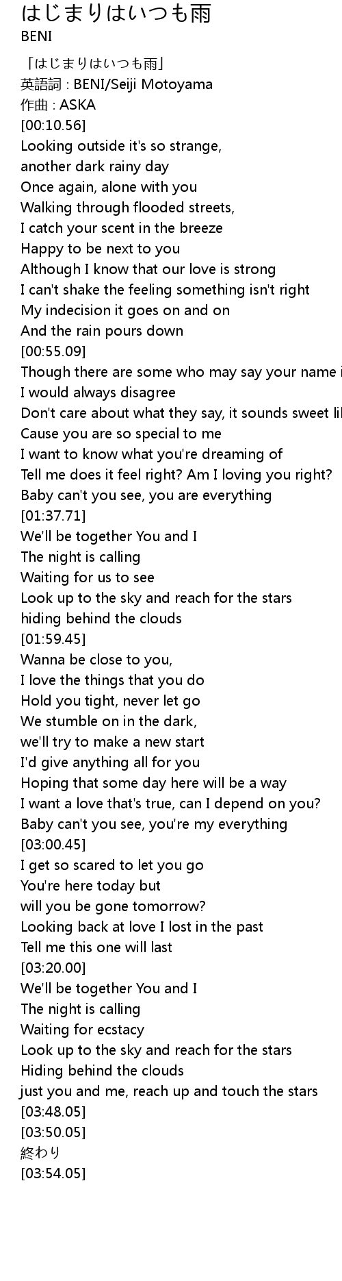| [00:04.56] | 英語詞∶BENI/Seiji Motoyama |
