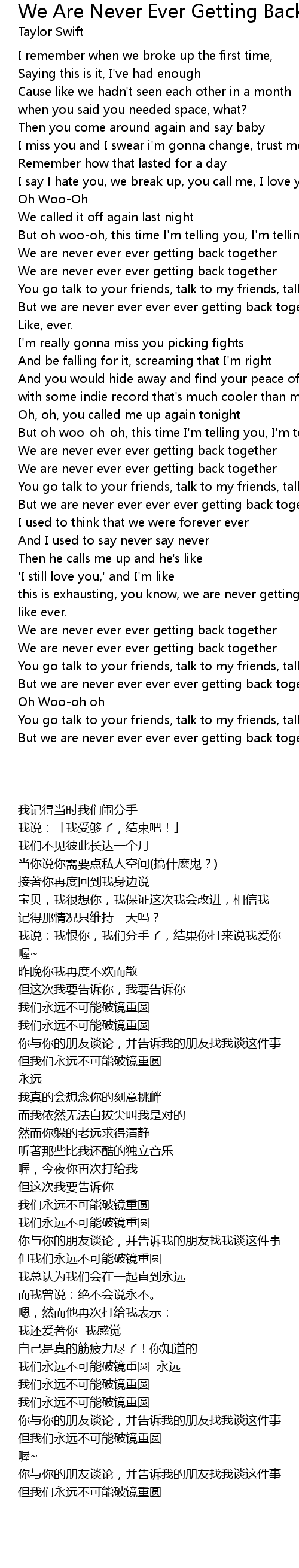 | [01:46.460] | But we are never ever ever ever getting back together. |