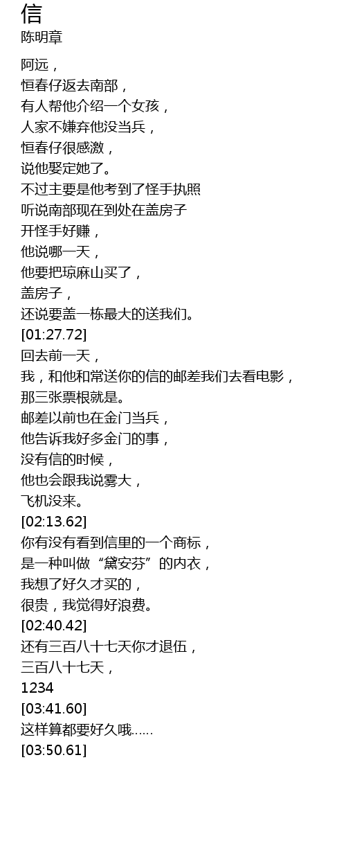 | [01:57.35] | 邮差以前也在金门当兵, |
