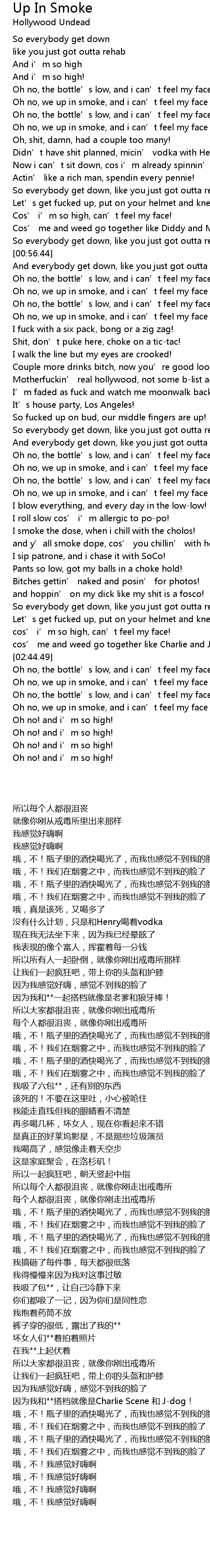 | [00:18.75] | Oh no, we up in smoke, and i can' t feel my face no mo'! |