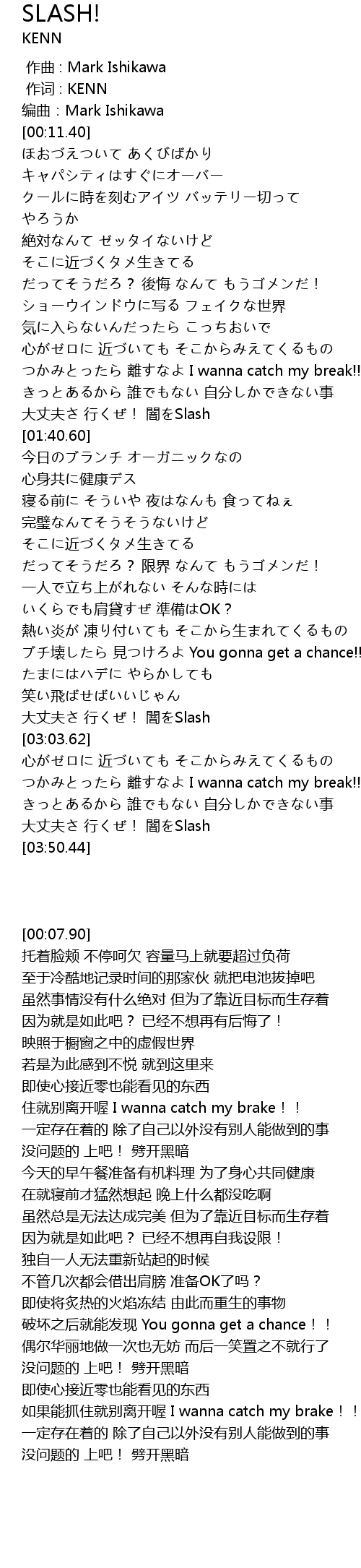 | [01:34.76] | 大丈夫さ 行くぜ! 闇をSlash |