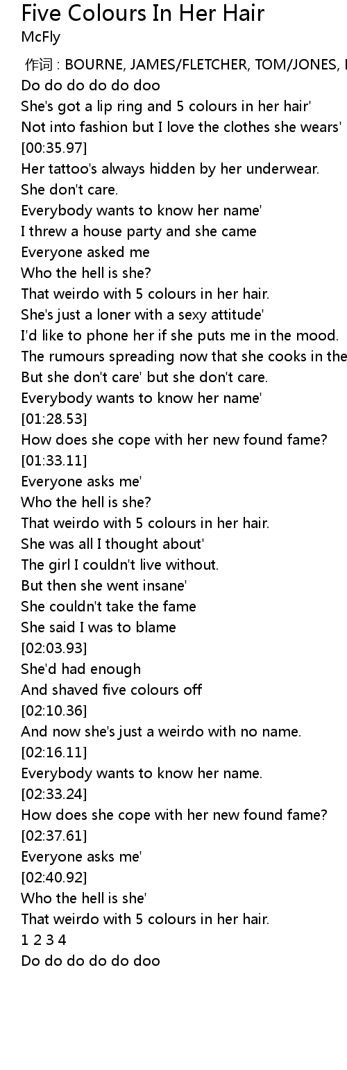 | [00:59.22] | That weirdo with 5 colours in her hair. |