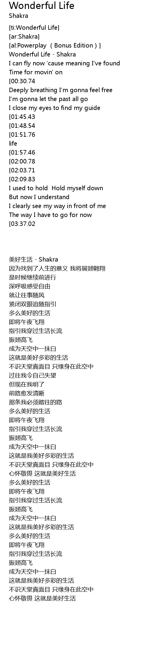 | [02:15.87][03:37.02] | In awe again it' s a wonderful life |