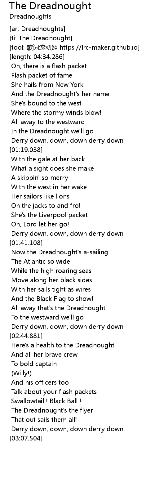 | [02:28.049] | Now the Dreadnought's a-sailing |
