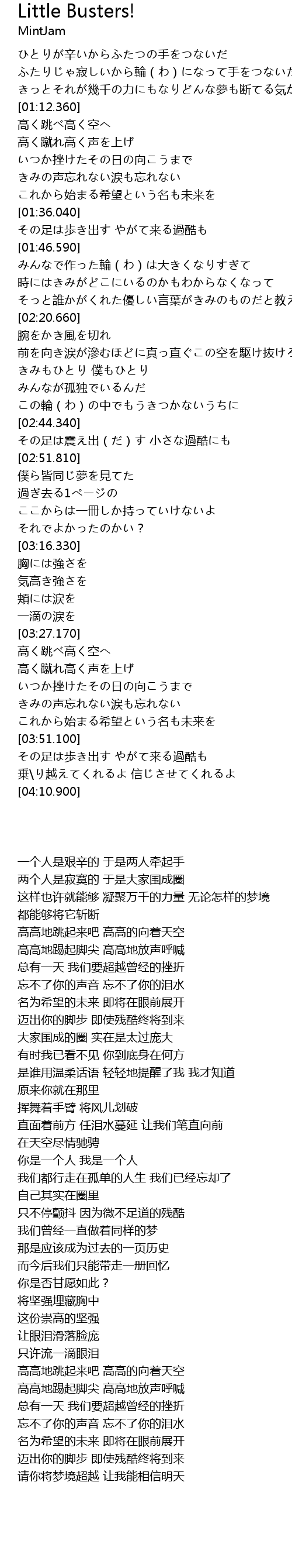 | [01:13.020] | 高高地跳起来吧 高高的向着天空 |