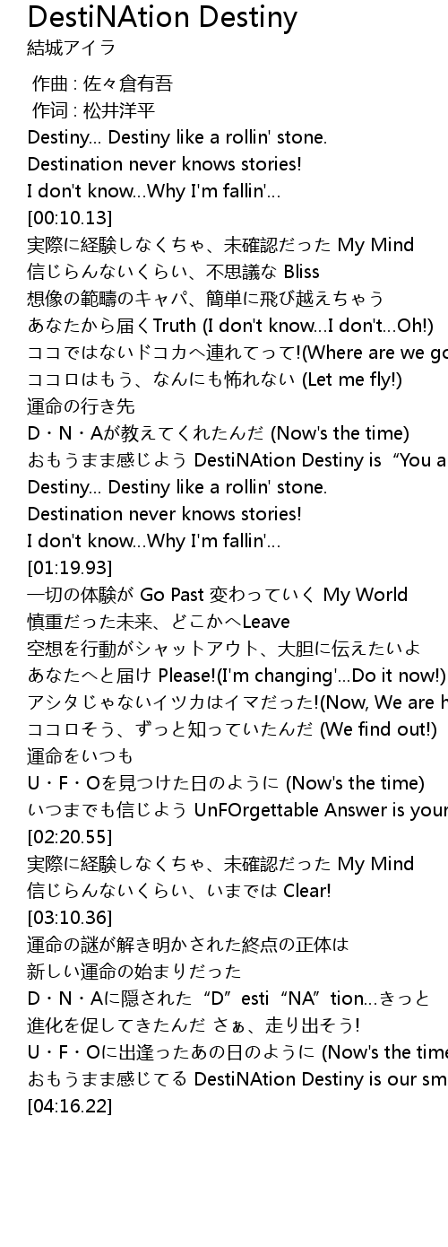 | [00:56.78] | おもうまま感じよう DestiNAtion Destiny is“You and I”. |