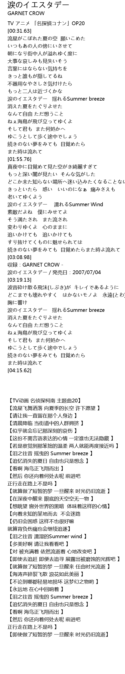 | [03:10.98] | 収録:GARNET CROW - 涙のイエスタデー/発売日:2007/07/04 |