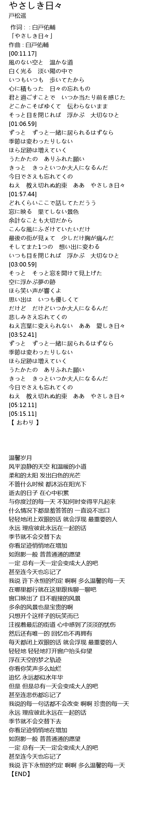 | [04:59.75] | ねえ 教え切れぬ約束 ああ やさしき日々 |