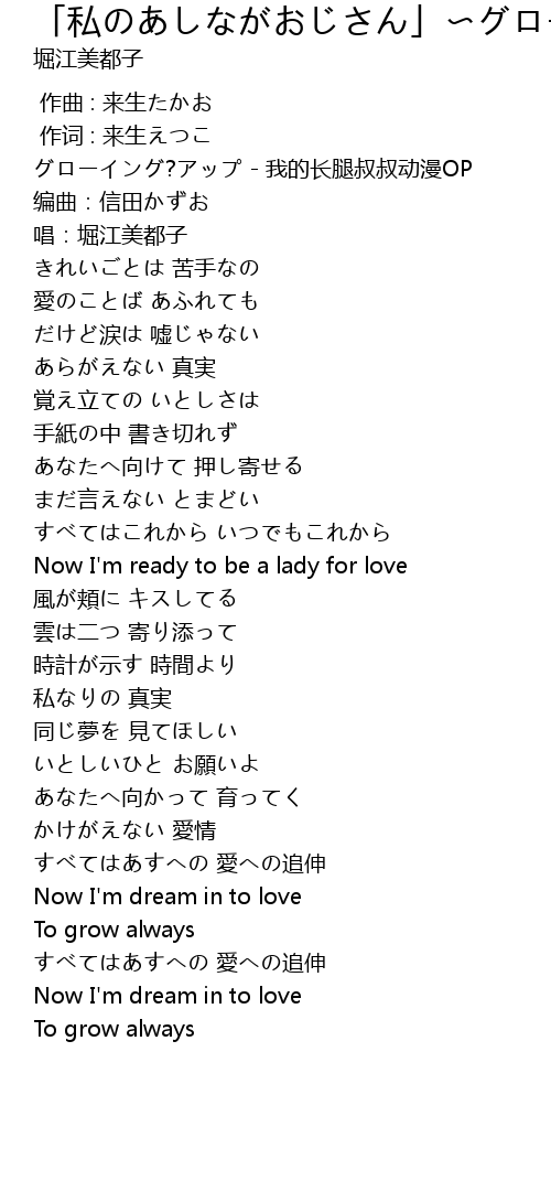 | [00:01.052] | グローイング?アップ - 我的长腿叔叔动漫OP |