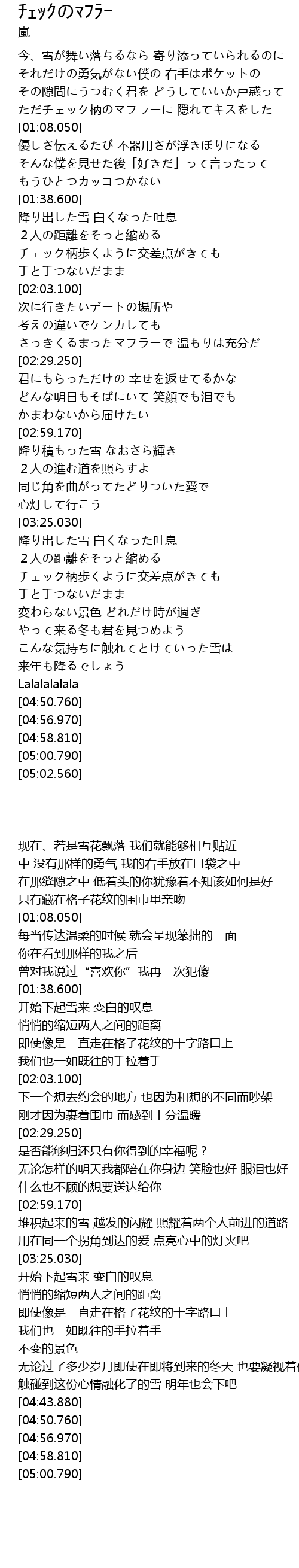 | [00:55.360] | ただチェック柄のマフラーに 隠れてキスをした |