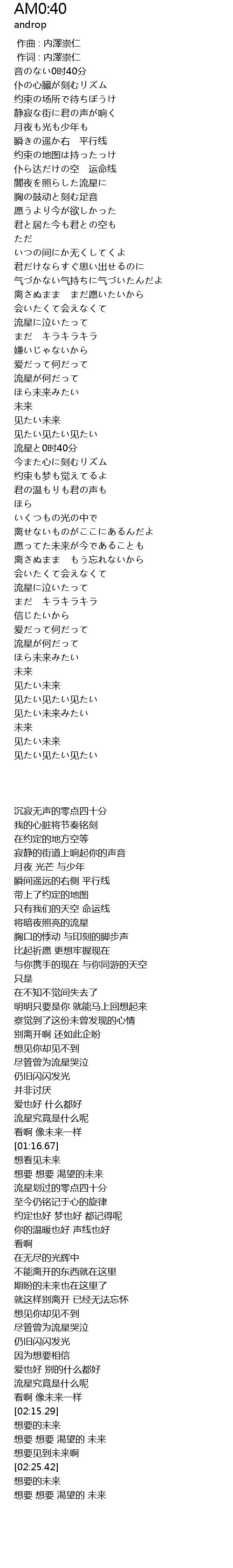 | [01:29.74] | 流星と0时40分 |