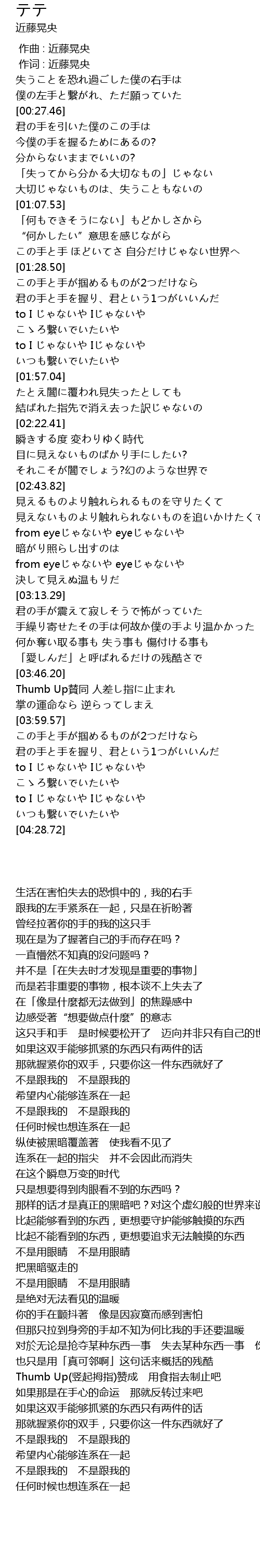 | [03:46.78] | Thumb Up(竖起拇指)赞成 用食指去制止吧 |