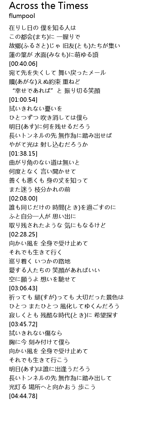 | [04:20.04] | 長いトンネルの先 無作為に踏み出して |
