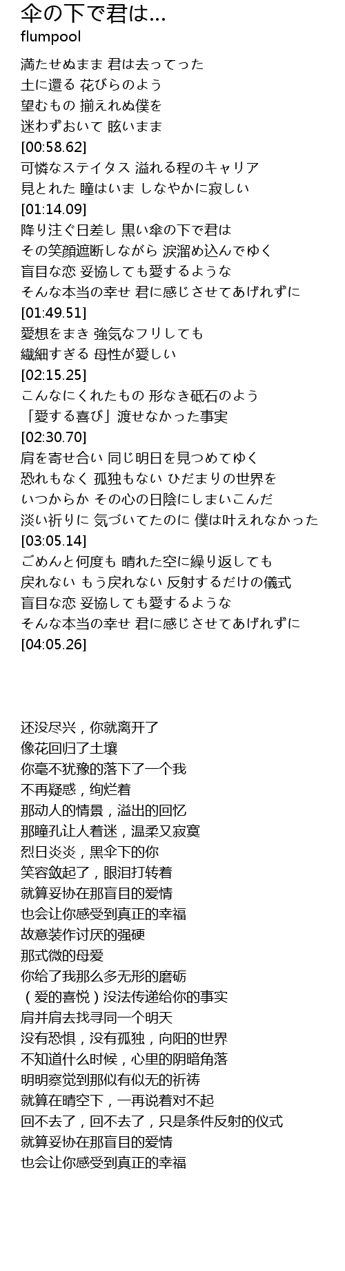 | [01:15.46] | 降り注ぐ日差し 黒い傘の下で君は |