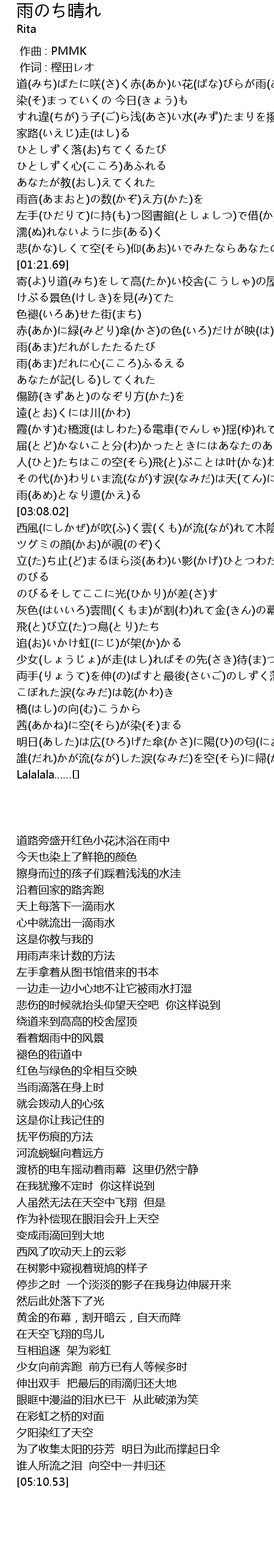 | [04:47.18] | 明日(あした)は広(ひろ)げた傘(かさ)に陽(ひ)の匂(にお)い集(あつ)め |
