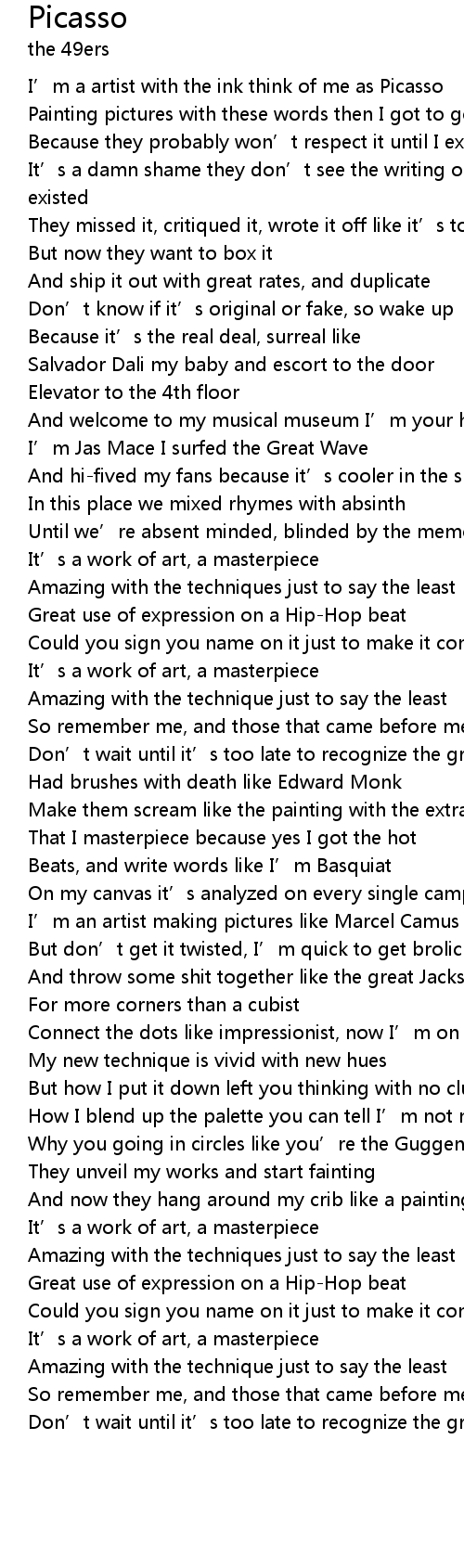 | [00:24.75] | I’m a artist with the ink think of me as Picasso |