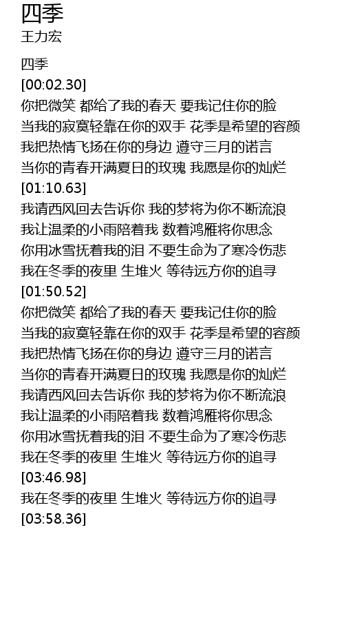 | [01:41.45] | 我在冬季的夜里 生堆火 等待远方你的追寻 |