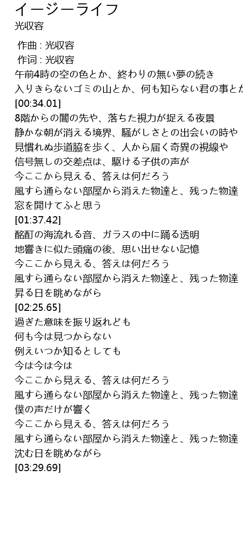 | [00:17.76] | 午前4時の空の色とか、終わりの無い夢の続き |