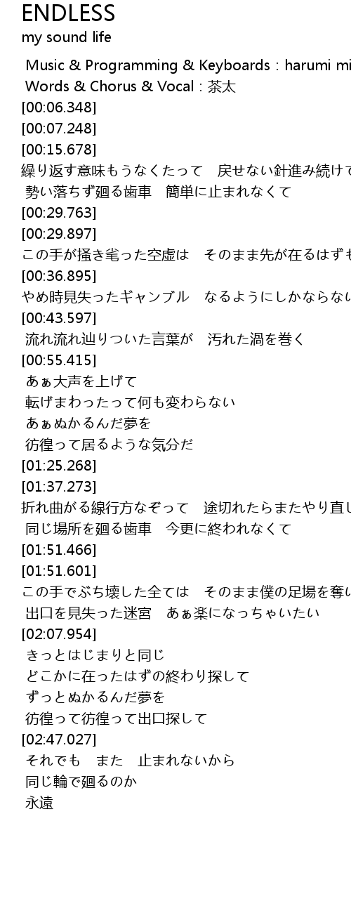 | [00:04.835] | Words & Chorus & Vocal:茶太 |