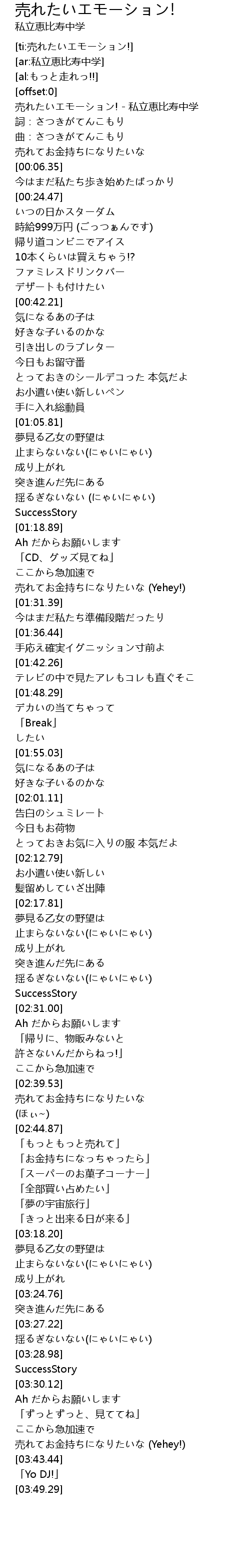 | [00:00.91] | 売れたいエモーション! - 私立恵比寿中学 |