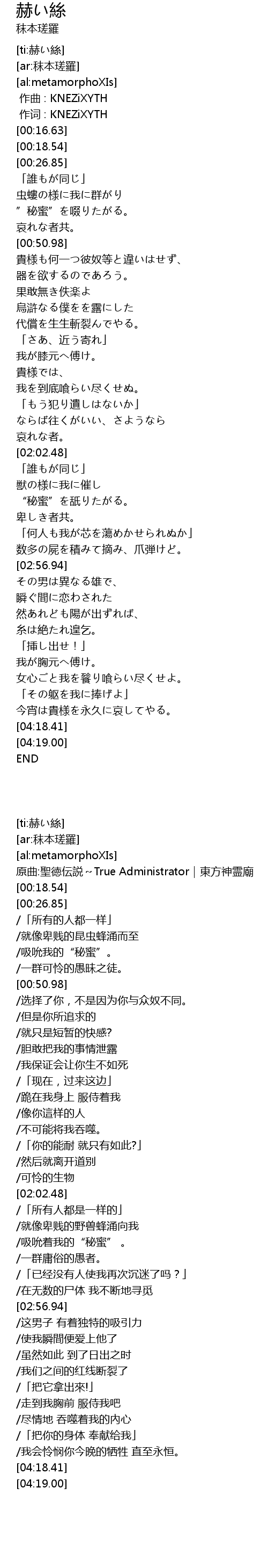 | [03:37.59] | 糸は絶たれ遑乞。 |