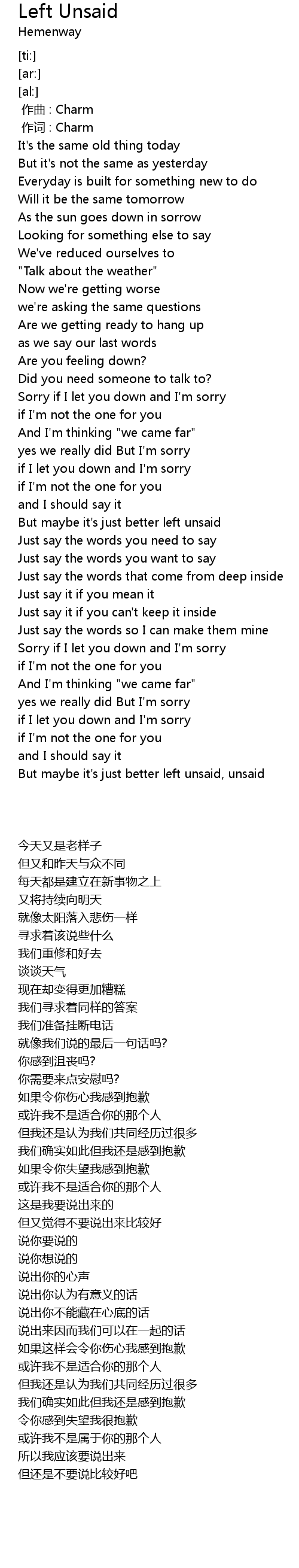 | [03:28.07] | But maybe it' s just better left unsaid, unsaid |
