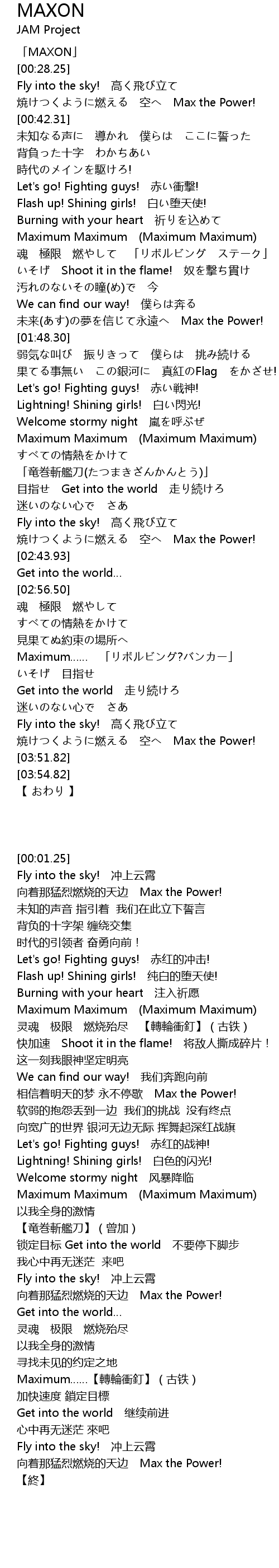 | [03:39.57] | 向着那猛烈燃烧的天边 Max the Power! |