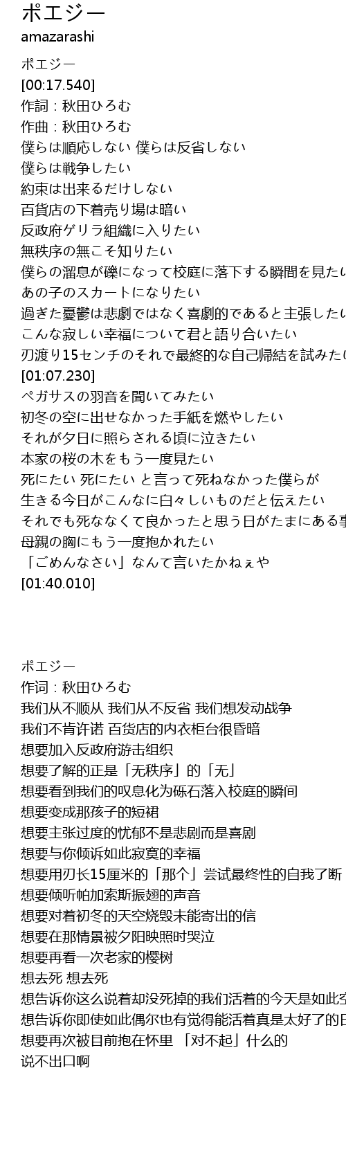 | [00:19.490] | 作词:秋田ひろむ |
