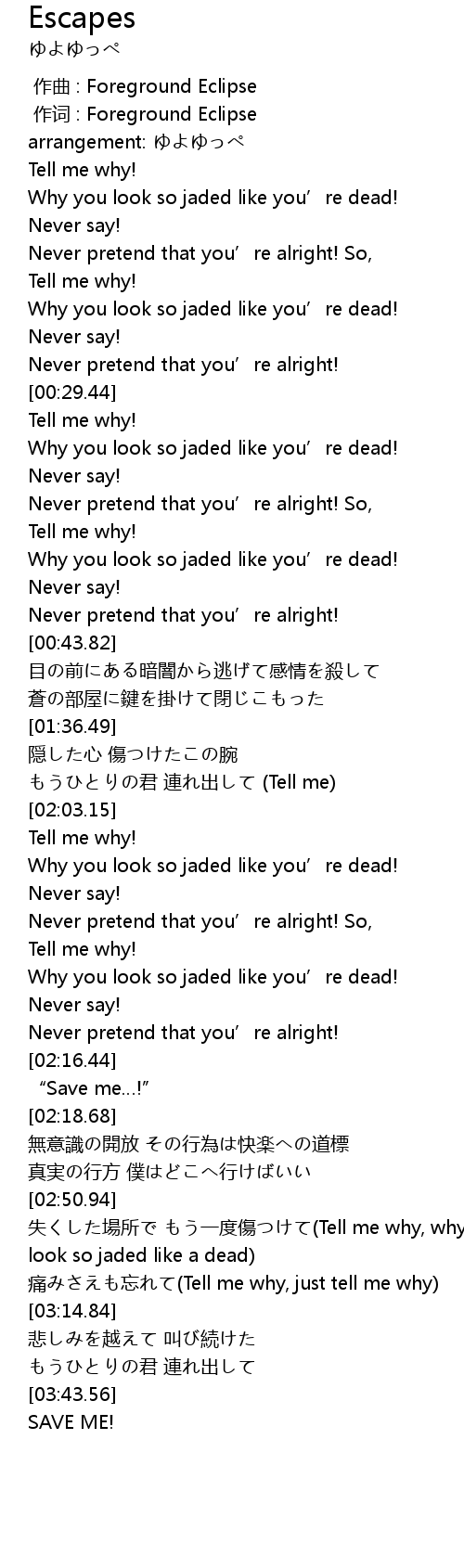 | [02:51.13] | 失くした場所で もう一度傷つけて(Tell me why, why you look so jaded like a dead) |