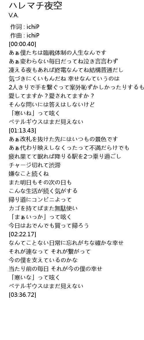 | [02:58.26] | なんてことない日常に忘れがちな確かな幸せ |