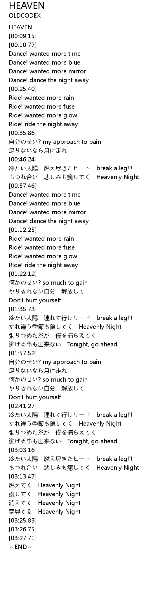 | [00:52.33] | もつれ合い 悲しみも癒してく Heavenly Night |